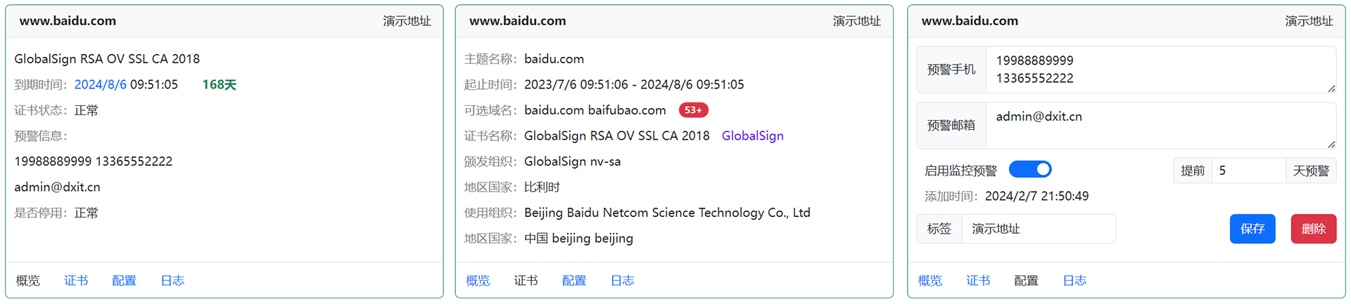 網(wang)站證(zheng)書監(jian)控(kong)系統還可監(jian)控(kong)網(wang)站證(zheng)書是否匹(pi)配(pei),避免錯誤安裝證(zheng)書。支持自定義設(she)置到期(qi)前N天預警(jing),且不(bu)會在晚上打擾(rao)。后期(qi)會推(tui)出(chu)證(zheng)書裝訂(ocsp)檢測(ce)及生(sheng)成(cheng),可解(jie)決國外證(zheng)書驗證(zheng)慢(man)的問(wen)題。